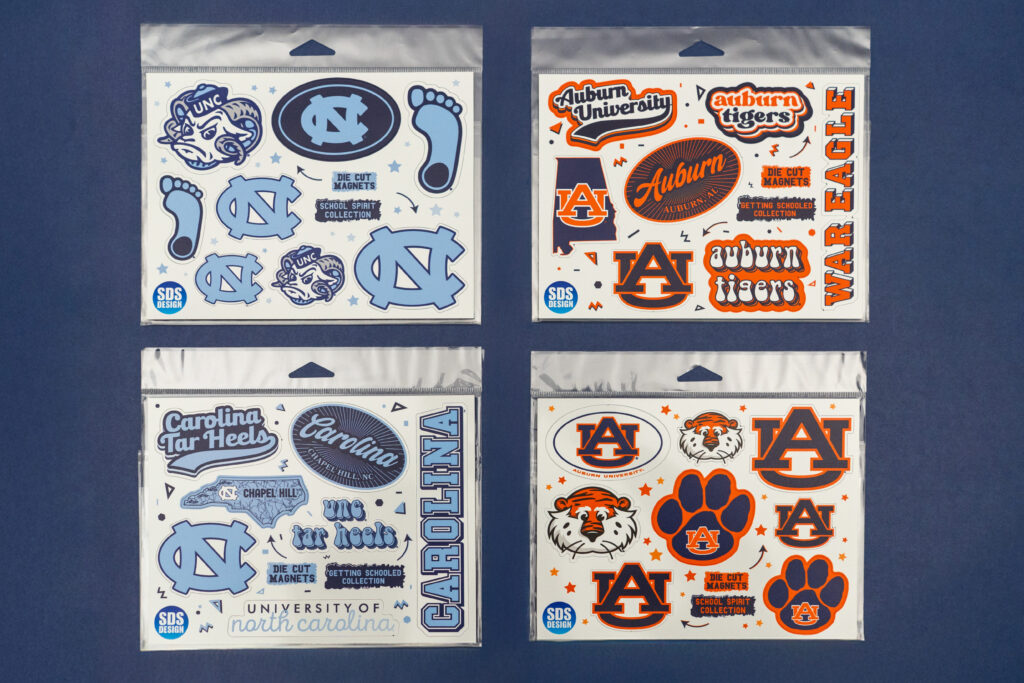 Magnet Packs are a 7.75” x 6” sheet of die cut magnets that can be easily punched out. The School Spirit Collection features main logos and mascots. The Getting Schooled Collection features trendy designs mixed with school logos.